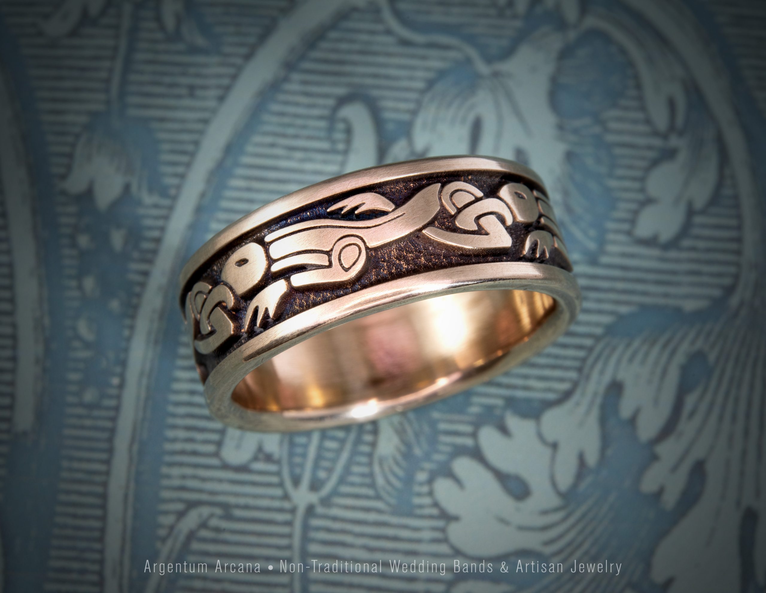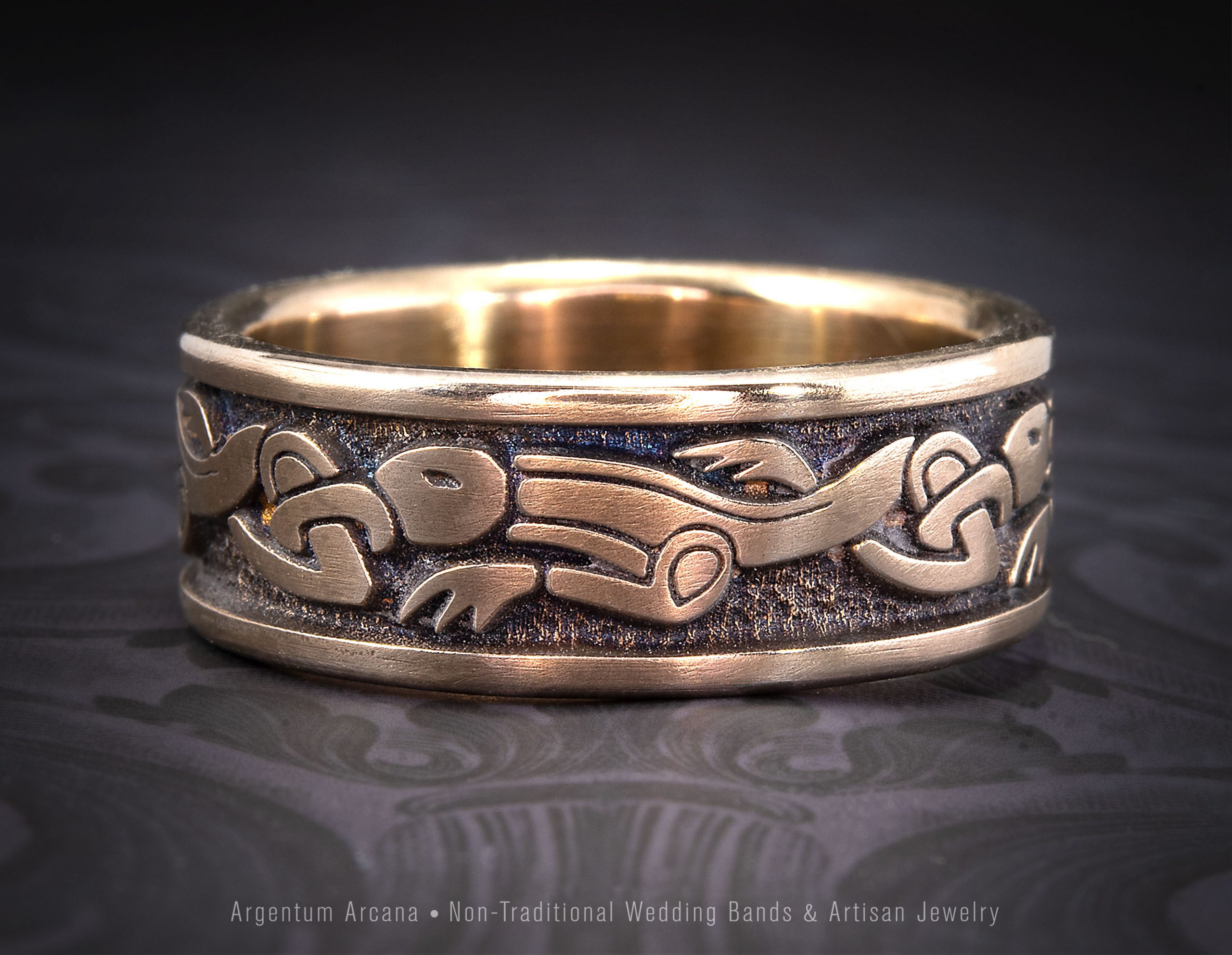 The Anglo-Saxon dragon design on this Bronze ring is based on a gold hilt-plate which was part of an Anglo-Saxon hoard dated to the 7th or 8th centuries which our founding artisan, Randy Mott, reinterpreted to fit the format of a ring. The hoard was discovered in Staffordshire England on July 5, 2009 by Terry Herbert, a metal detector enthusiast.