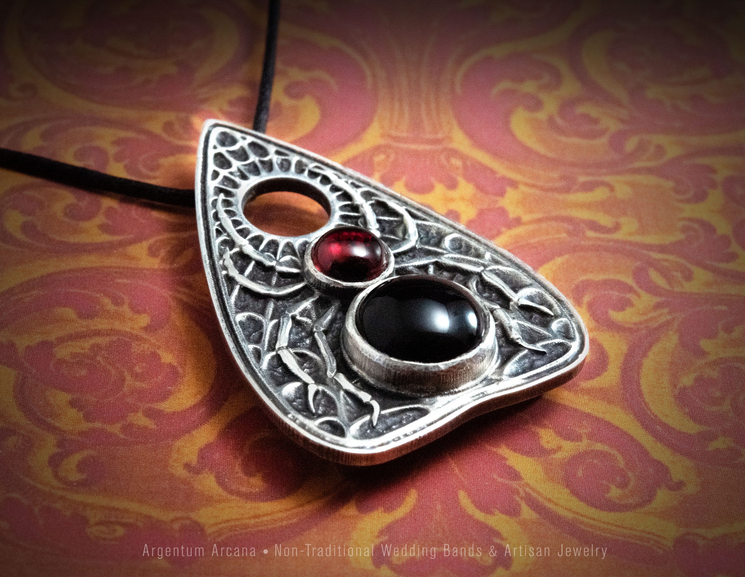 Used for many years to commune with the spirit realm through spirit boards, such as the Ouija board, the planchette conjures up images of seances, mysticism, and the supernatural. The central red garnet in this design is enhanced with a technique borrowed from the ancient Anglo-Saxon and Viking craftspeople where the metal behind the stone is chased with a texture of small indentations that makes the stone appear to shine with an inner flame.