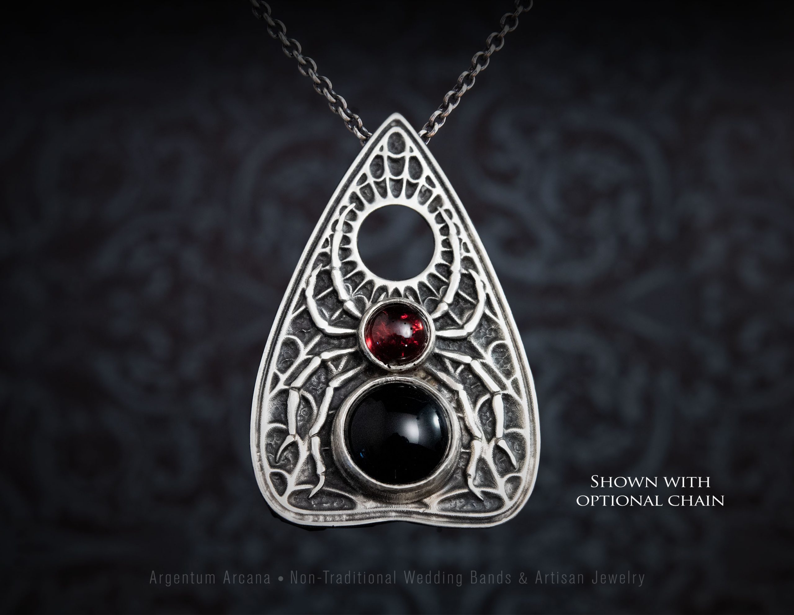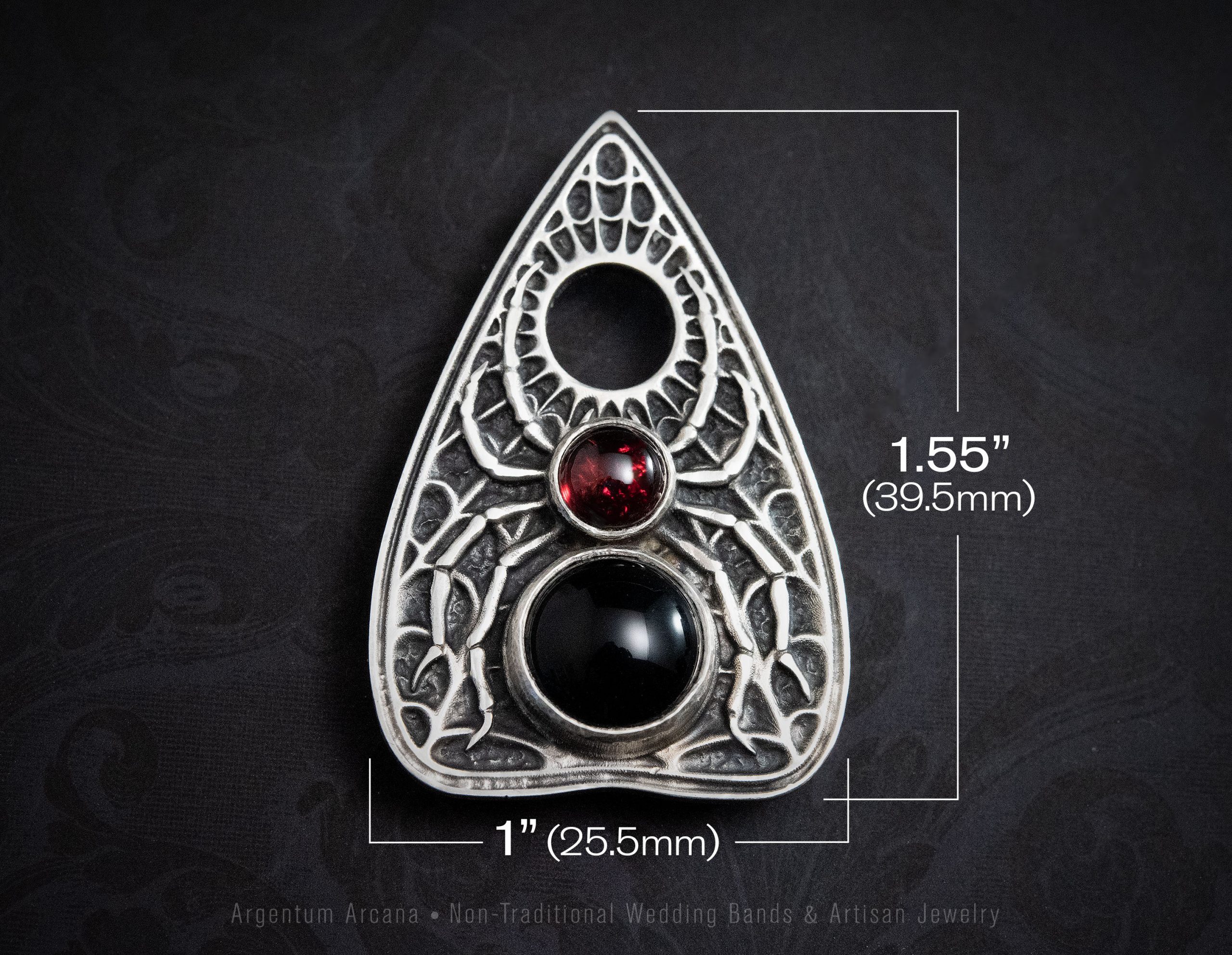 This planchette pendant necklace features a spider design accented with a 6mm natural red garnet and a 10mm natural black onyx stone. It measures approximately 1.55″ (39.5mm) tall and 1″ (25.5mm) wide.
