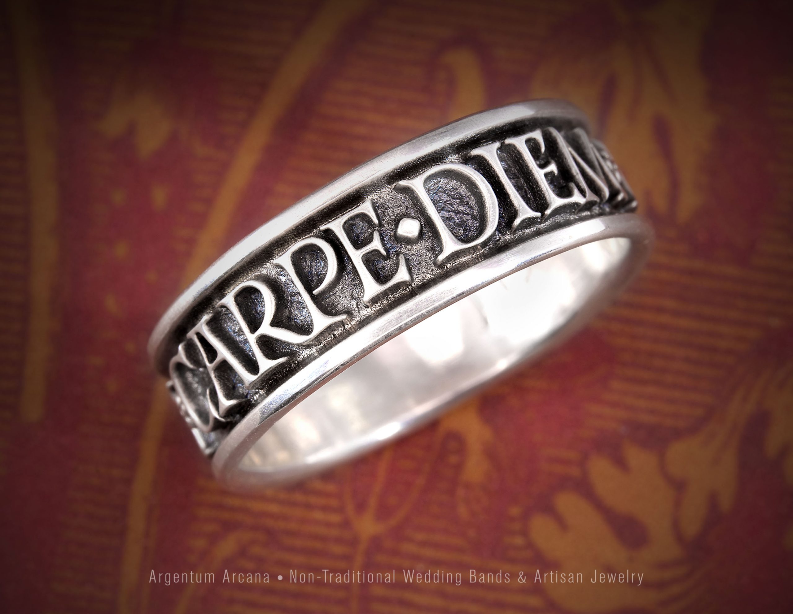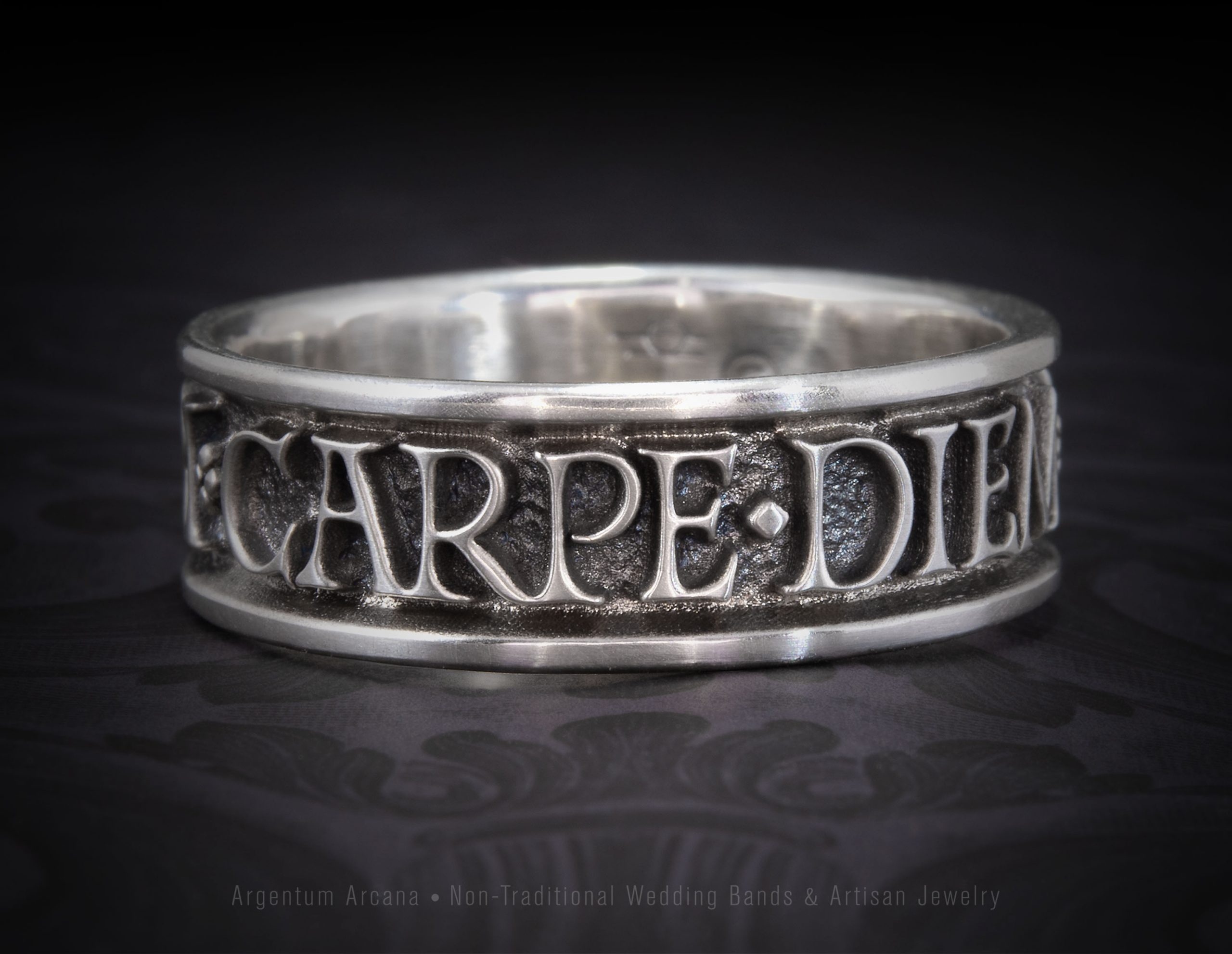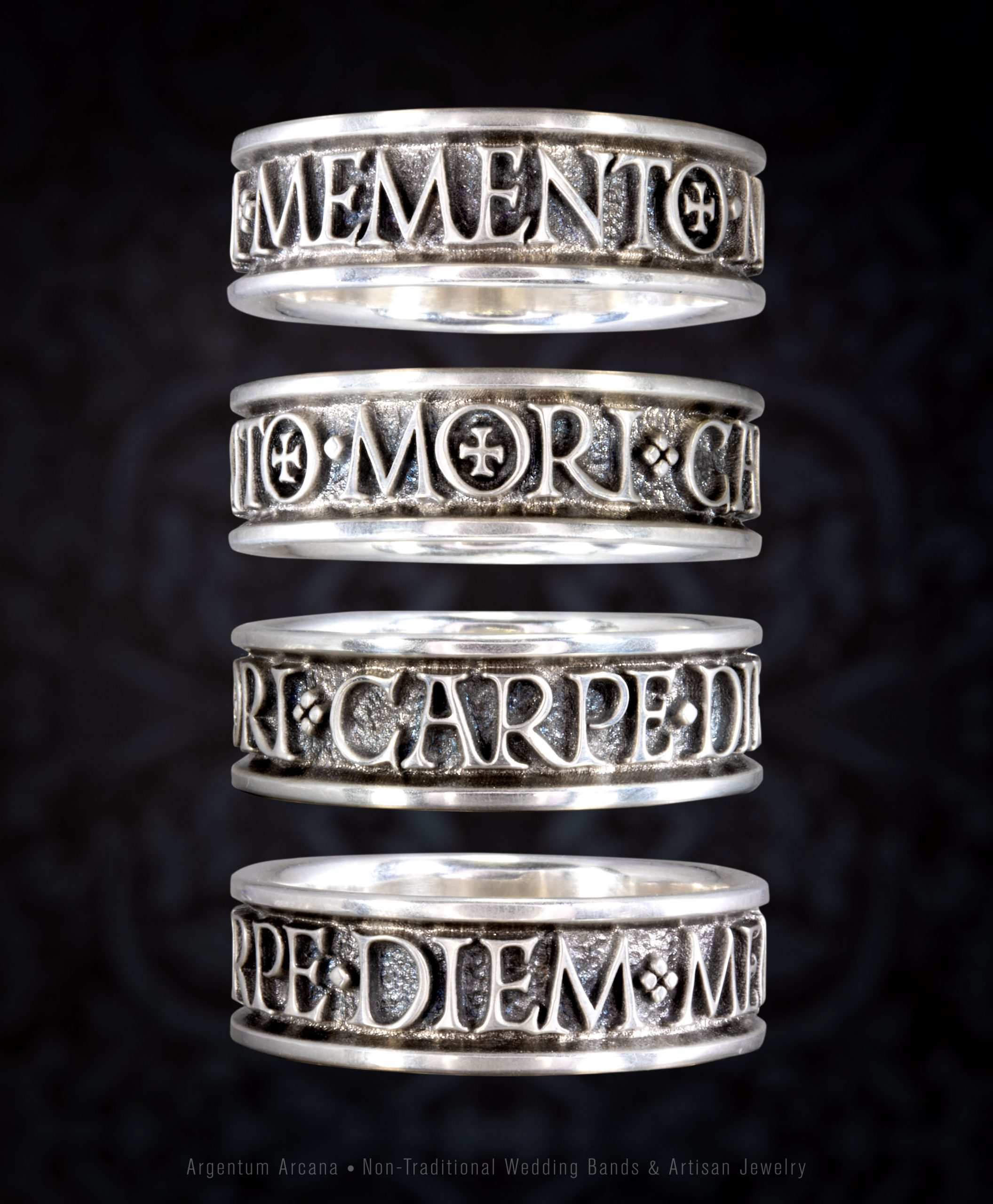 The Memento Mori Carpe Diem ring is an Argentum Arcana original design. The words were hand lettered and then sculpted by founding artisan Randy Mott and then cast in sterling silver and hand finished and polished in the Argentum Arcana workshop.