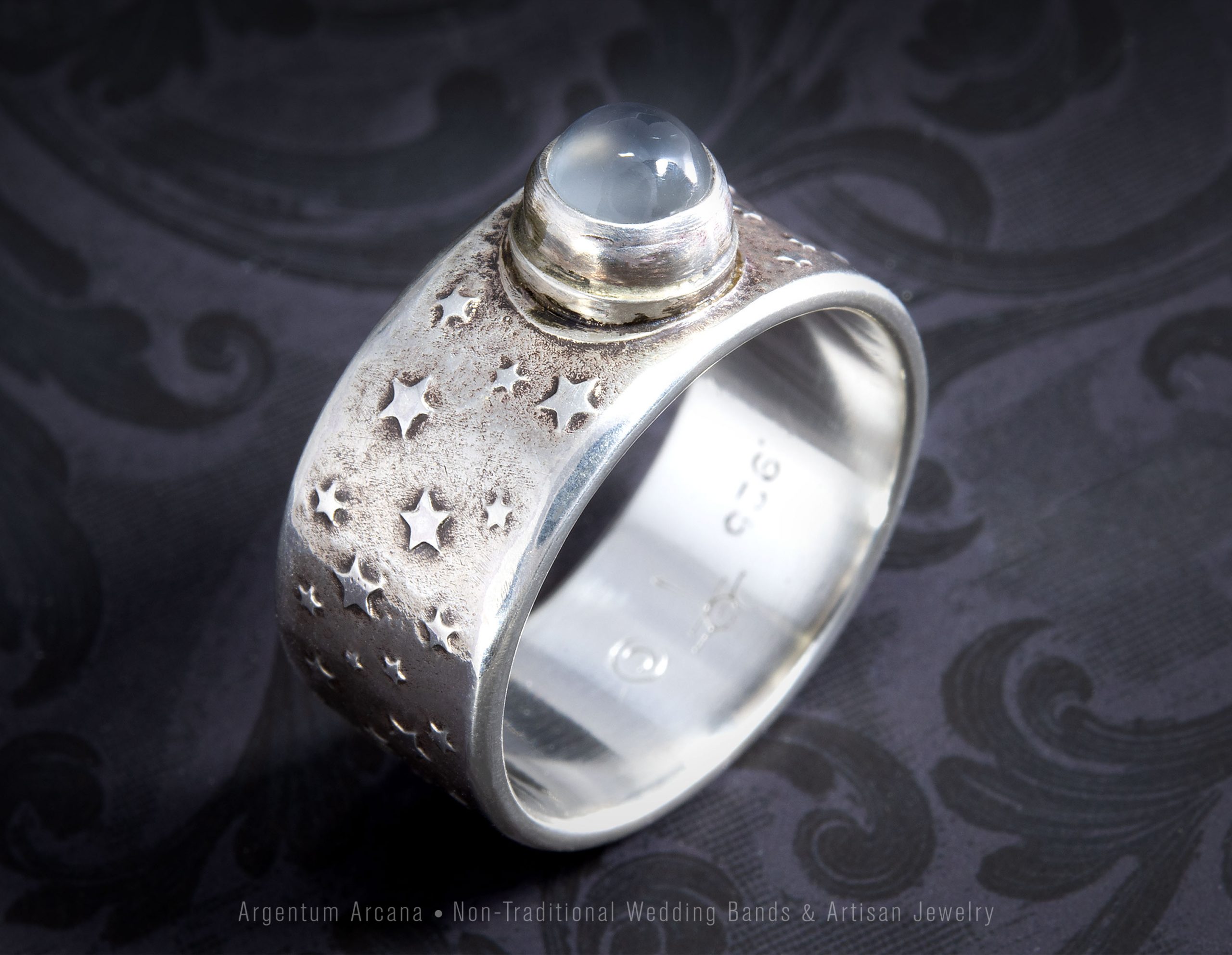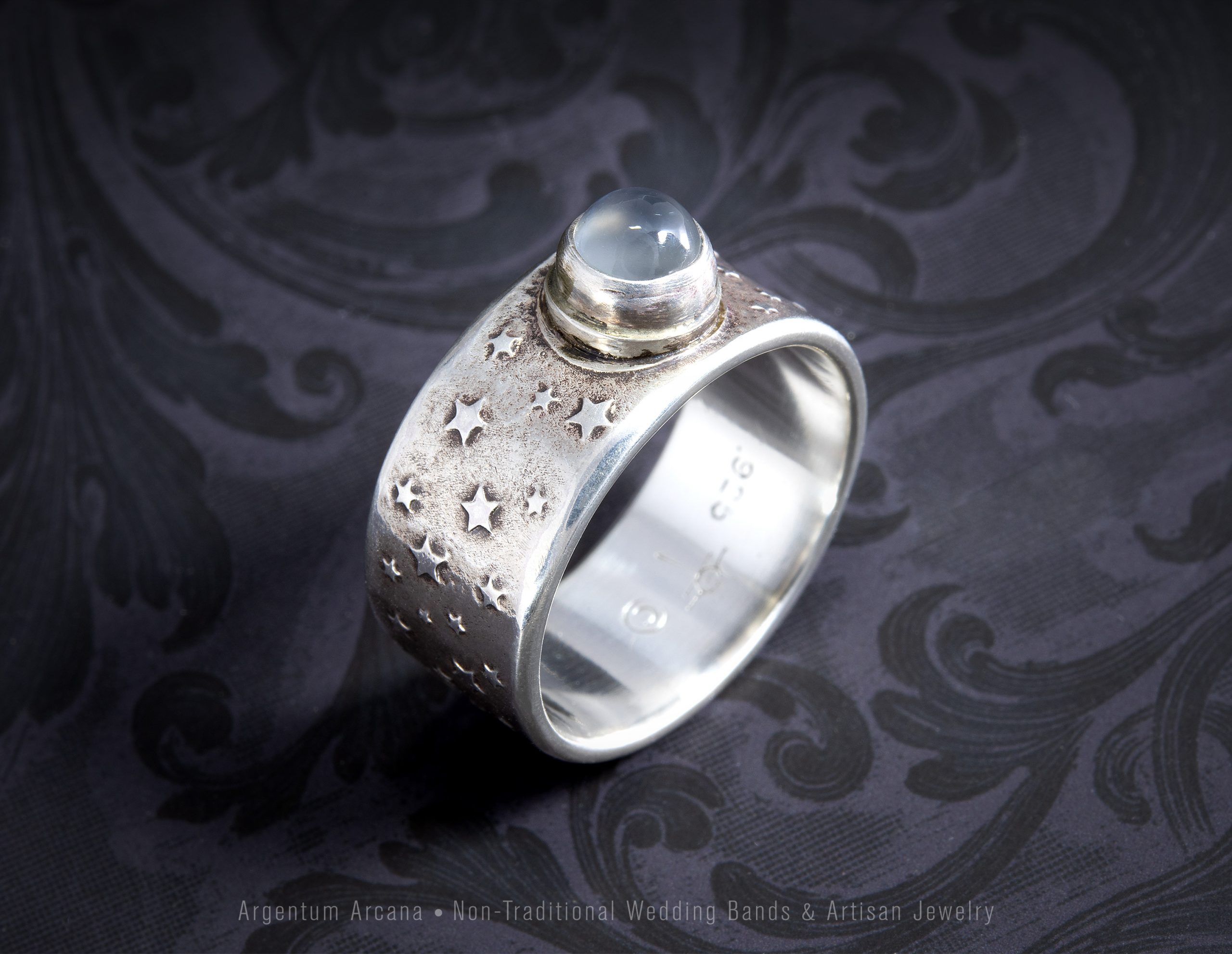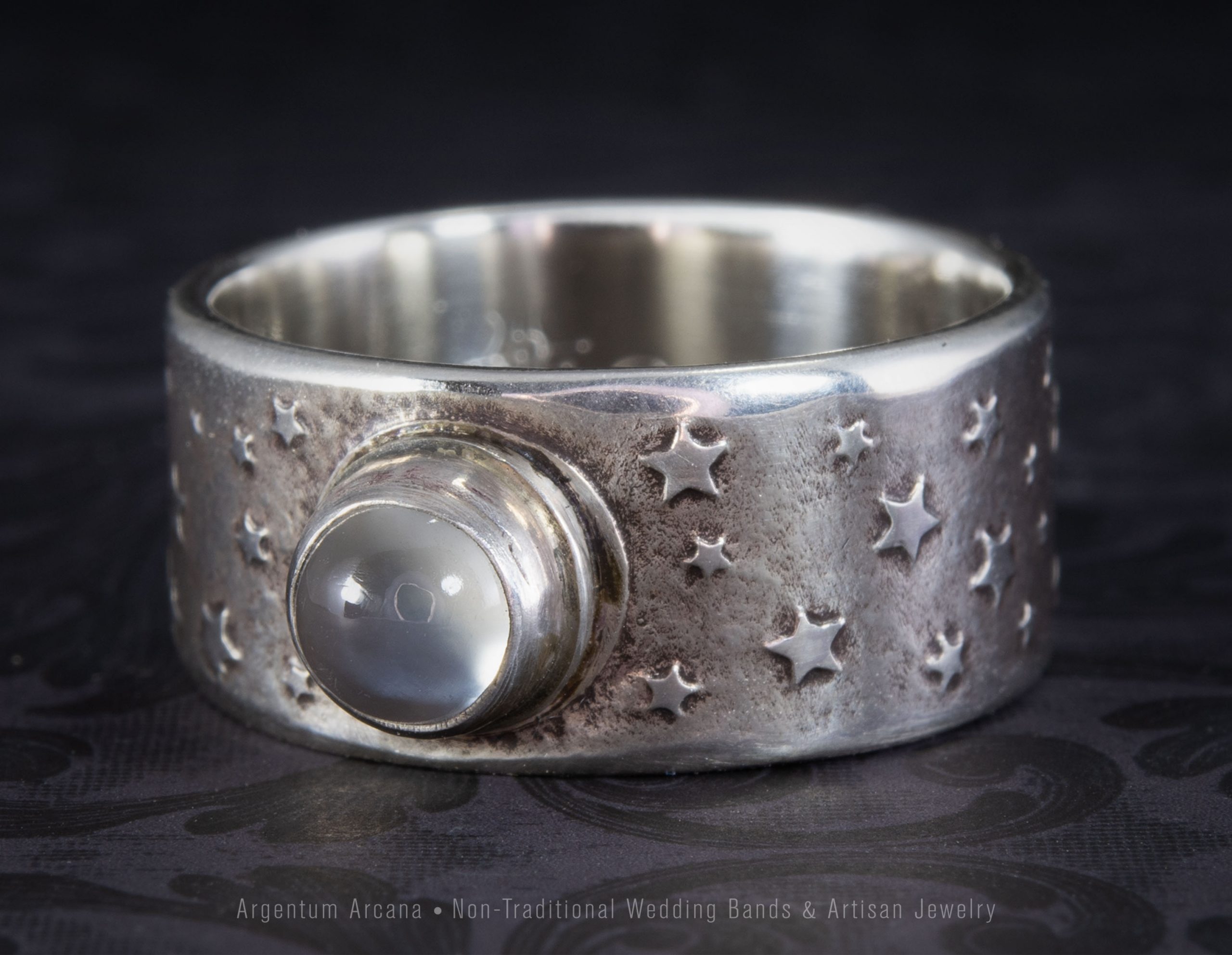 This whimsical, unusual ring features a 6mm natural Moonstone on a field of raised silver stars encircling a wide silver band. Lovers of astronomy and astrology, as well as those searching for ancient Witchy, Perfect for lovers of the Moon and stars, and for those looking for a truly unique design in an engagement, wedding, or Pagan hand fasting ring. It makes a cool and unusual bridesmaid’s gift, too. Moonstone is an enchanting gemstone, and it’s one of the June birthstones.