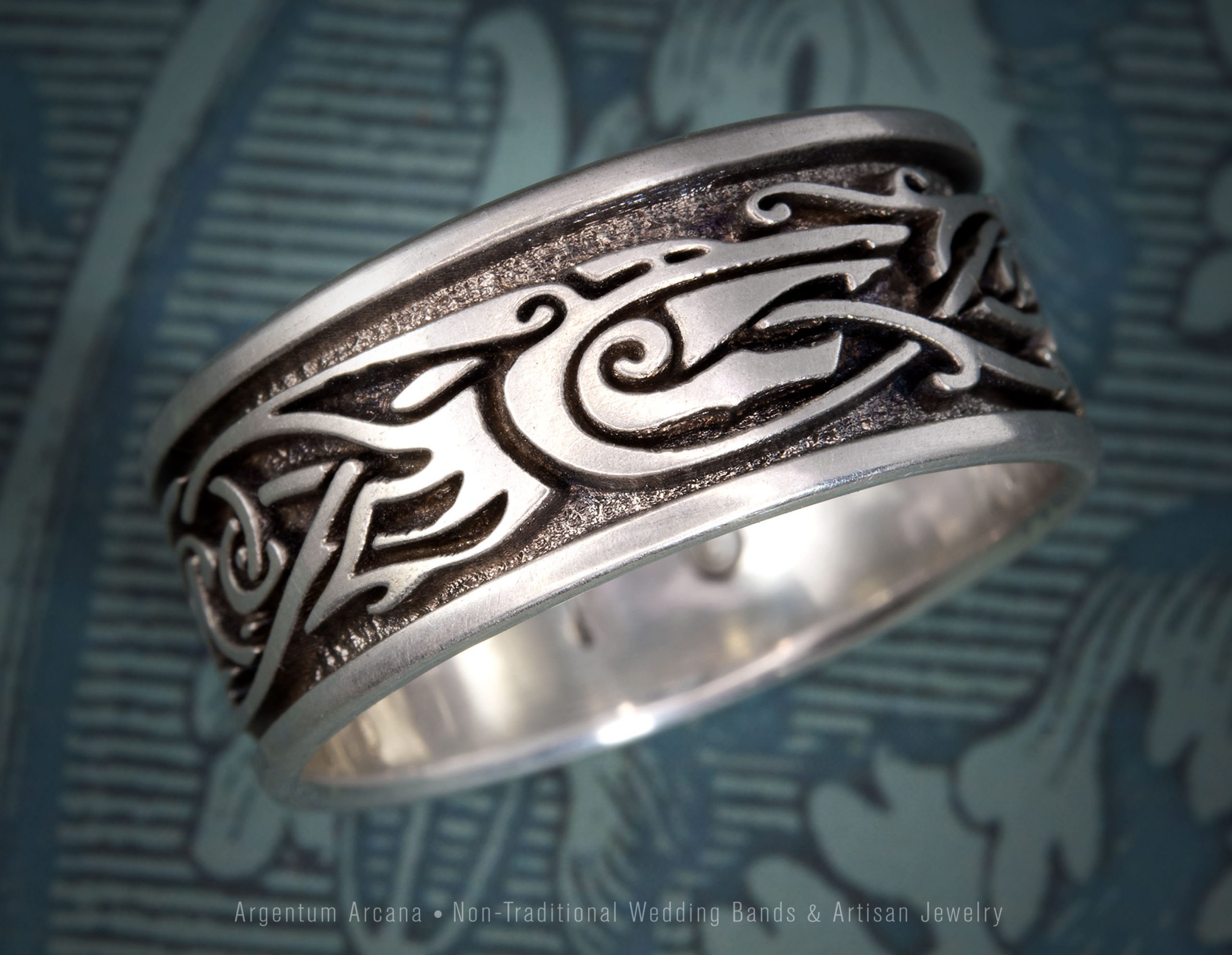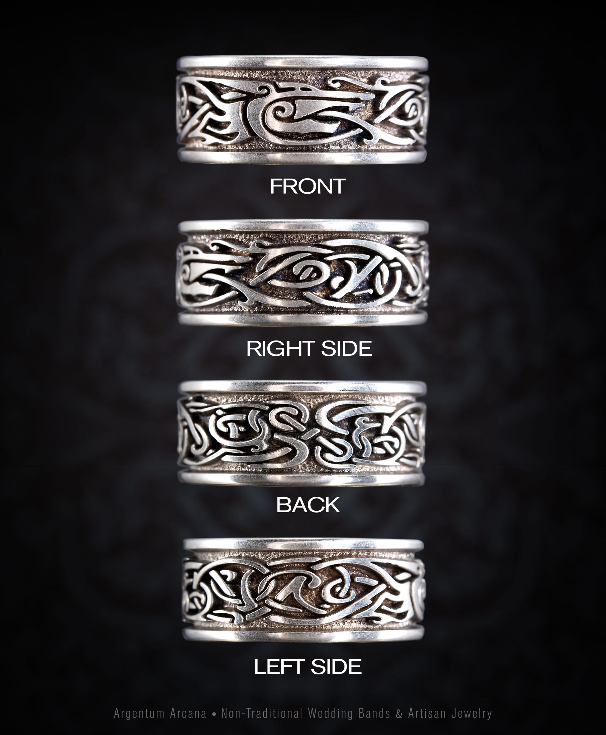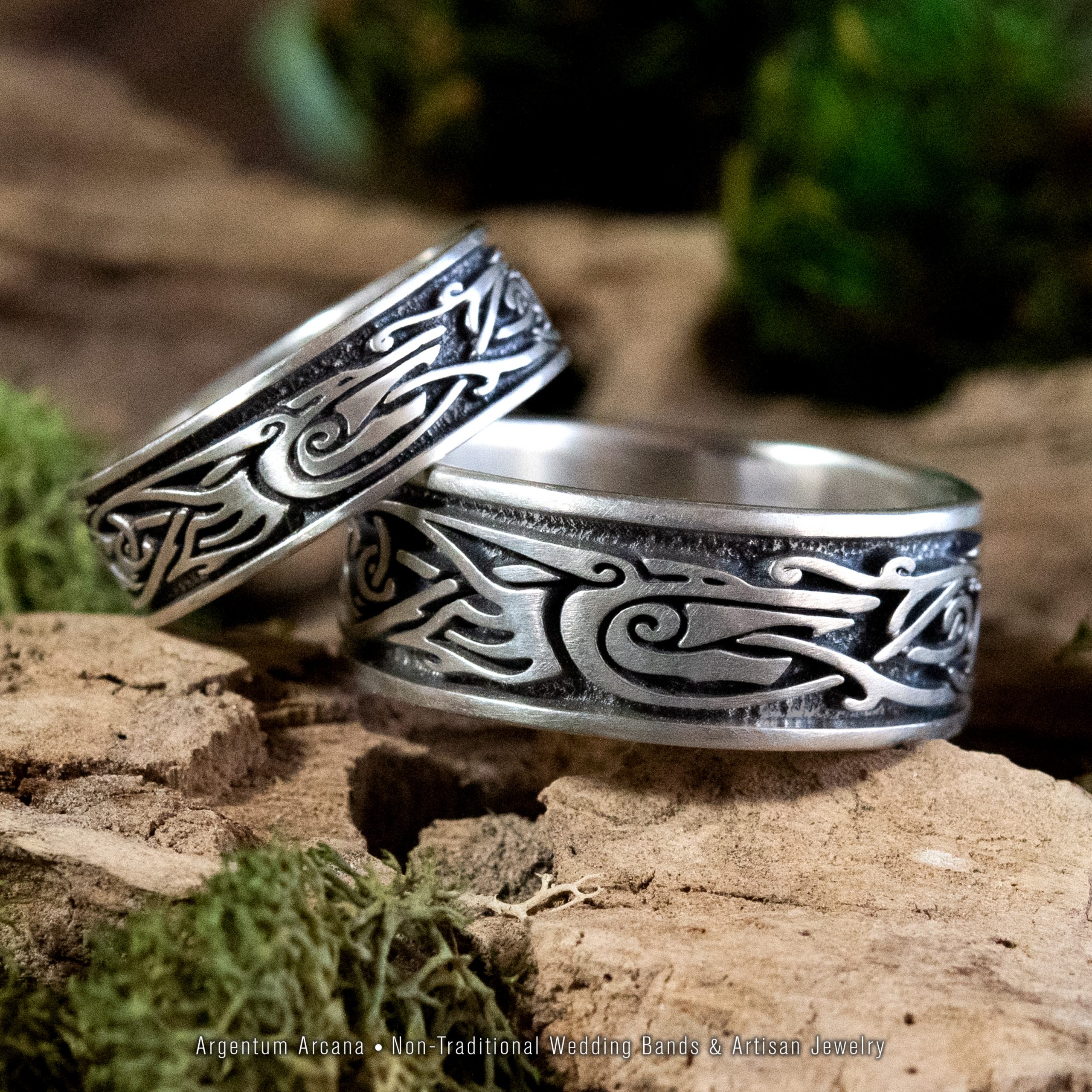 This matching pair of Viking Wolf rings features our original wolf design which was inspired by the amazing scroll work seen in Medieval artifacts and jewelry of the ancient Vikings, Norse, Celts, and Anglo Saxons. If you love Viking jewelry this pair will make beautiful and unique non-traditional his and hers wedding rings or hand fasting rings.